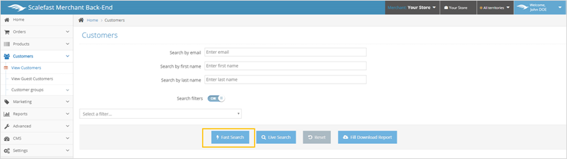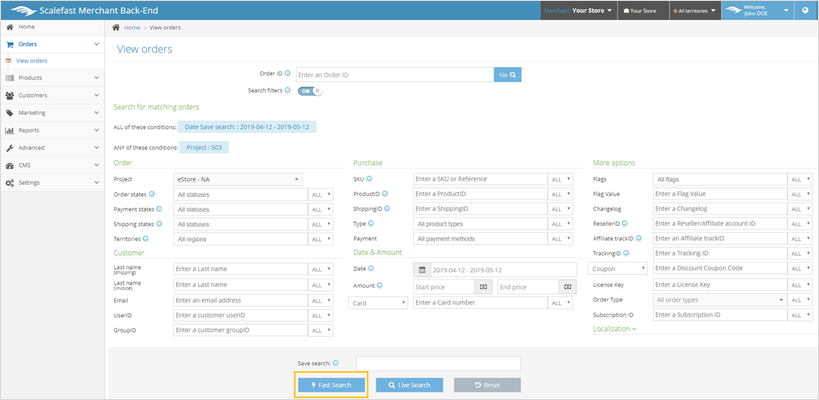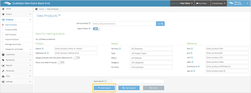Fast Search is a service created to improve the search speed in Scalefast´s Merchant Back-End. By combining ElasticSearch software and our API endpoints of listing, results are displayed much faster than the regular search.
